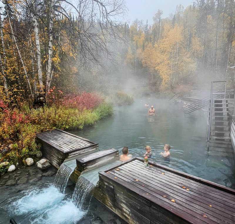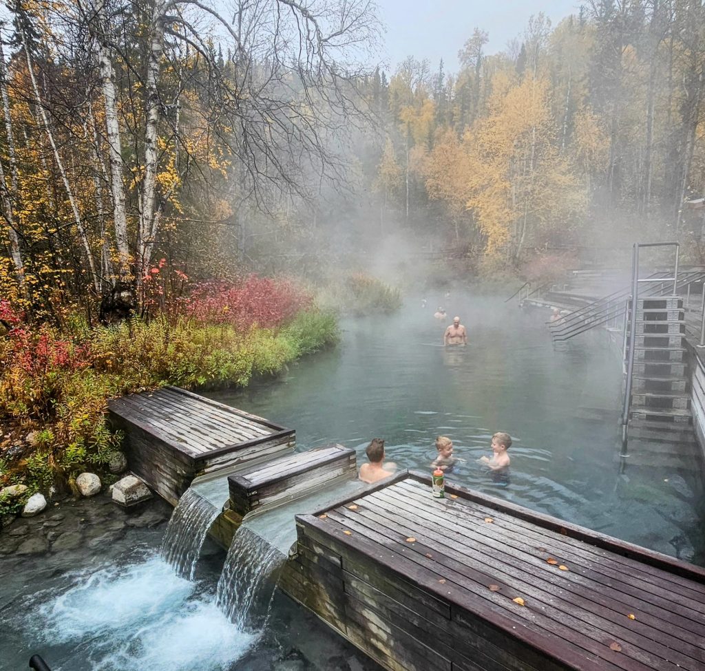 אחת העצירות המהנות בדרך היתה בליארד הוט ספרינגס (Liard Hot Springs), שבצפון קולומביה הבריטית, על גבול יוקון. המעיינות היו אבן חן נסתרת, מעין ספא טבעי בלב השממה. טבלנו במים החמים, מוקפים בצמחייה ירוקה, והילדים שיחקו במים בזמן שאנחנו נחנו, מניחים לחום להרגיע את גופנו העייף מהדרכים. זה היה המקום המושלם לפני המשך הנסיעה אל "פארק היורה של קנדה" – דרך כבישי צפון בריטיש קולומביה, המוקפים ביערות עבותים והרים מרשימים.