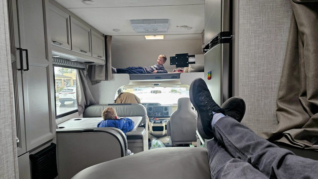 במהלך הנסיעות, הילדים ישבו מאחור, ליד שולחן קטן שאפשר להם לאכול, לצייר, או לשחק משחקי קופסה. בנסיעות ארוכות יותר, אפשרנו להם גם לנוח במיטה האחורית או בתא העליון מעל הנהג. אמנם הקרוואן עצמו נושא אזהרה מפני שכיבה במהלך נסיעה, אך משיחות עם מקומיים רבים גילינו שאין אכיפה ממשית בנושא, ואנשים נוטים להשתמש במרחב באופן גמיש יותר. לעיתים, האזנו יחד לפודקאסטים (כשהייתה קליטה), והקרוואן הפך למעין בית קטן ונעים שהעניק לילדים את ההפוגות הנדרשות להם – זמן משחק, זמן לבד וזמן מנוחה – בתוך שגרת טיול אינטנסיבית. החוויה הפסטורלית של הקרוואן התבטאה דווקא בדברים הפשוטים: הכנת ארוחות בזמן הנסיעה, פיקניקים בנופים עוצרי נשימה, ושייק פירות בבלנדר בבוקר. אלה היו הרגעים שהוסיפו ערך ומשמעות לטיול והפכו אותו לבלתי נשכח.