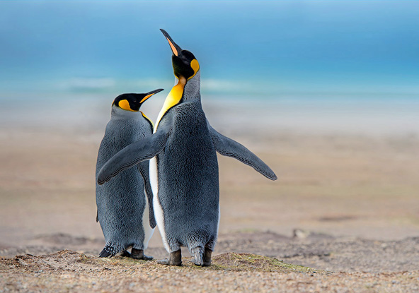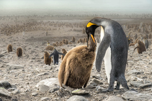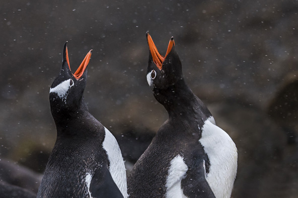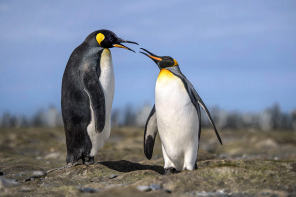 בשולי מושבת הג'נטו הגדולה באי סונדרס, שוטטו מספר זוגות של פינגווינים מלכותיים. הפינגוין המלכותי הוא השני בגודלו אחרי הפינגוין הקיסרי המקנן בעומק היבשת הקפואה. גודלו ויופיו משך הרבה תשומת לב ועורר התלהבות מצד חברי המסע. הזוג המלכותי המצולם כאן התבודד במרחק מה מהמולת הג'נטו והפגין התנהגות טקסית כחלק מתהליך חיזור לוהט. התמקדתי זמן ממושך בתיעוד דפוסי ההתנהגות של הזוג המיוחד הזה, משום שלא תיארתי לעצמי שבהמשך המסע נפגוש באיי ג'ורג'יה הדרומית אוכלוסיות נוספות של הפינגוין הגדול הזה המונות למעלה מ-200,000 זוגות…