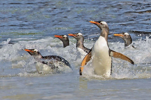 לאחר שני ימי הפלגה באוניה מנמל אושואיה (Ushuaia) נחתנו לראשונה באמצעות סירות הזודיאק באי סונדרס (Saunders Island) במערב פוקלנד. כבר בחוף, ברגעי הנחיתה, שמחתי למראה קבוצת הג'נטו, שהופיעו לפתע פתאום ונגלו לעינינו מתוך קצף הגלים… הם דידו בהילוך אנושי מהדס לעבר מושבת הקינון שלהם בעומק האי, שם הם הצטרפו לאלפי זוגות שאכלסו מושבת קינון שהייתה כבר בדגירה. הם חזרו לחוף כשבטנם ככל הנראה מלאה בדגים וסרטנים לאחר שעות דייג יומי שבילו בלב האוקיאנוס.
