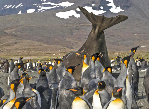 בעת שהתמקדתי לצילום קבוצת הפינגווינים המלכותיים, התרומם במפתיע סנפיר הזנב הענק ברקע. אחד מגדולי פילי הים המיוחמים שרבצו בשקט, החליט להפגין את נוכחותו לעיני נקבות ההרמון שלו…. הזכרים מרשימים בגודלם, הם ממש ענקיים! משקלם יכול להגיע ל-4 טון. למרות גודלם הם לא בהכרח מגושמים, הם יכולים להפגין תנועה מהירה ביבשה ולהשיג במהירות אדם רץ. ובים הם אלופי צלילה. במצוד אחרי דגים ודיונונים הם צוללים אפילו לעומק של למעלה מ-1500מטר!