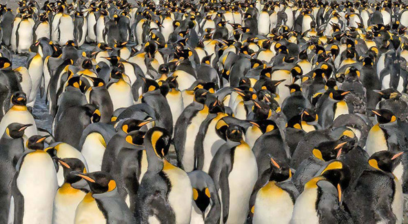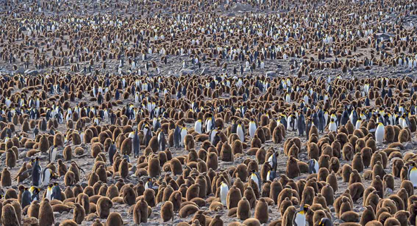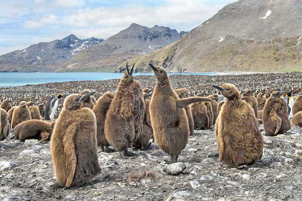 מפרץ סנט אנדרוס. צעירי הפינגווין המלכותי מצטופפים יחד בהמוניהם במעין גן ילדים, בשעה שמרבית ההורים נמצאים בלב הים לשיחור מזון. התפתחותם איטית, חודשי הקיץ הקצרים אינם מאפשרים להם להגיע לבגרות לפני בוא החורף והם מצטופפים יחד בימים הקרים. בשונה מהבוגרים, שאצלם כסות נוצות דקות וצפופות ופלומה הצמודה לעור, לצעירים פלומה חומה שעוטפת אותם כמו מעיל פרווה. ריכוזים גדולים של בוגרים נראו בשולי "גן הילדים". הם ניכרים בלבושם הצבעוני הכולל "ג'קט" אפור-כחול עם צווארון כתום.