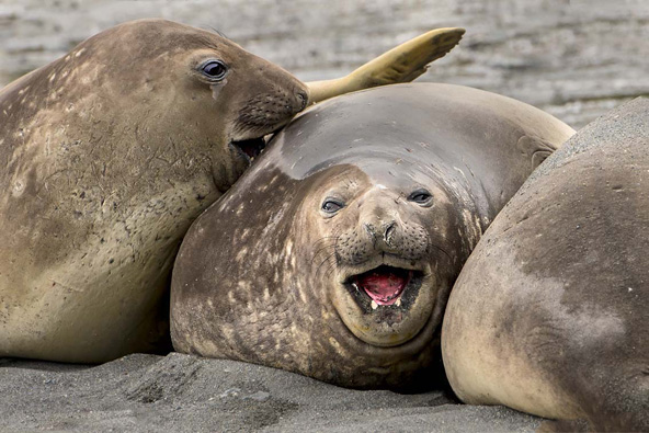 מפרץ סנט אנדרוס הוא ביתם של למעלה מ-6,000 פילי ים. המקום ידוע כאחד מאתרי הרבייה הגדולים של פילי הים בדרום ג'ורג'יה. בזמן שהותנו בחופי המפרץ נראו מאות פילי ים רובצים במנוחה על החוף. מרביתם נקבות וצעירים, כמו אלה שמופיעים בצילום. הזכרים הבוגרים ניכרים במידותיהם המרשימות. הם תוחמים לעצמם טריטוריית חוף בה הם מרכזים ושומרים על "הרמון" נקבות, איתן הם מזדווגים בכל עת "שבא להם".