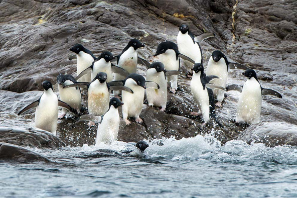 קבוצת פינגוויני אדלי מהססת האם לקפוץ לים, חופי Kinnes Cova באנטארקטיקה