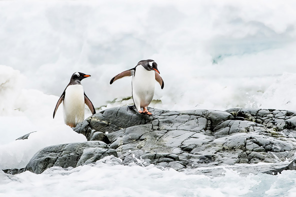 Danco Island,  בלב נוף קרחונים מרהיב, הוא ביתם של 1,600 זוגות מקננים של פינגווינים לבני אוזן, ג'נטו. הזוגות מקננים על קרקע גלויה ולא על קרח. הקן בנוי ממעגל אבנים קטן בקוטר של כ-20 ס"מ. האבנים נאספות ונגנבות מקן לקן, ולא אחת "הגנבים" נתפסים "על חם" ומנוקרים על ידי בעלי הקן… הזכרים אוספים את האבנים ומתצפיות חוקרים עולה שלא אחת הנקבה מתרצה לזכר הודות לאבן יפה ונחמדת שהביא לה. הזוג המצולם שרוי בעיצומו של טקס החיזור ומכריז בלהט בתרועות חוזרות ונשנות על הטריטוריה האישית שלו בלב המושבה.