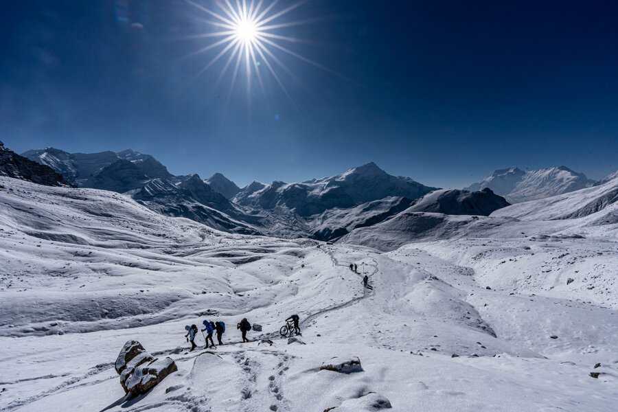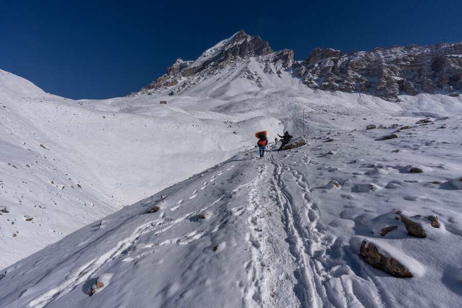 הפאס, כמה שרשראות דגלים טיבטיים ושלט קטן בגובה 5,416 מטר, הפיק מכולנו קריאות שמחה והקלה. אחריו חיכתה ירידה אין סופית, תלולה, של עשרה קילומטרים עד סיום הטרק בכפר מוקטינט בגובה של 3,800 מטרים.
