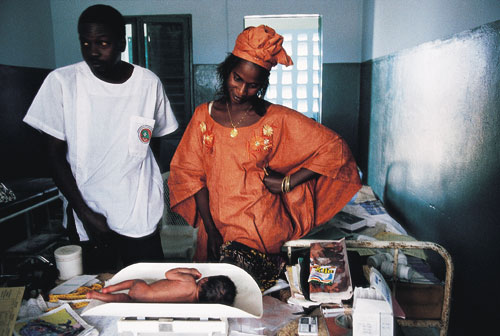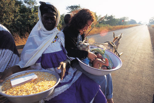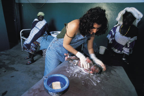 | אינדי והמיילדת של הכפר בדרך למרפאה בדיאלקוטו, עם התינוק שנולד למשפחת דארמה בלילה. התינוק, עדיין מחובר לשלייה בחבל הטבור, הובא למרפאה לחיתוך חבל הטבור כי בכפר לא היה סכין חד מספיק | איברהמה סק, אח המנהל את המרפאה בתפקיד רופא, אחראי על 50 כפרים. תמותת ילדות נפוצה כאן מאוד. נערה בת 14 שהגיעה למרפאה מדממת, אמרה שקיבלה מחזור, אבל התברר שהתביישה לספר שנכנסה להריון וניסתה לגרום לעצמה הפלה. כעבור שעתיים היא נפתרה | אנידי, שהגיעה לכפר כמתנדבת בתחומי בריאות ותזונה ב"חיל השלום", רוחצת תינוק לאחר לידה במרפאה בדיאלקוטו, המרוחקת כשני קילומטרים מהכפר. רוב התינוקות אינם מחוסנים, ורק ארבעה מתוך עשרה שורדים |