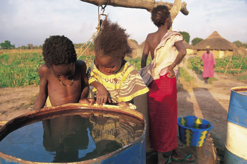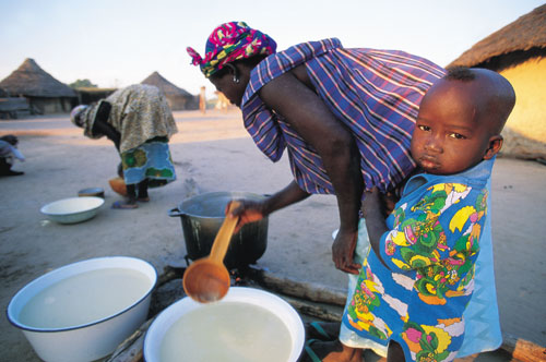 | ילדי הכפר ליד הבאר המקומית. מקלחת היא חוויה בפני עצמה: באמצעות דלי קטן אנחנו שופכות על עצמנו מים, מתרחצות לאיטנו, כשמעלינו כיפת שמים ענקית | אחת מנשי משפחת דארמה מבשלת לכל אנשי הכפר דייסת דוחן לשבירת צום הראמדאן. כולם כאן מוסלמים, ובכפר יש ריכוז גבוה של מלומדים דתיים. הם זוכים להערכה רבה מתושבי הסביבה, ולפעמים שולחים לכאן ילדים מכפרים אחרים ללמוד קוראן |
