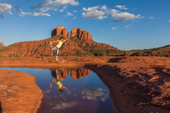 תרגול יוגה מול סלע הקתדרלה בסדונה