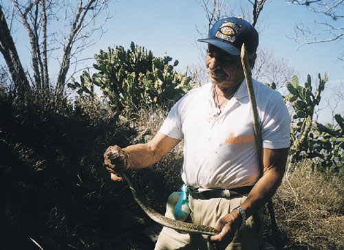 כשטיפסנו על הפירמידה השנייה, אלפונסו עצר בעדי ולא נתן לי להמשיך. אני לא שמעתי דבר, אבל הוא ניגש בביטחון לאחד מפתחי הפירמידה, תקע את מקלו באדמה, הושיט במהירות את ידו והנה נחש פעמונים תפוס בראשו נמצא בידיו. אולי בגלל הלחץ העז, ירק הנחש את הרעל הלבן, שנראה כקצף שנאגר זמן רב. הנה שומר הסף, הצייד־הניצוד, עומד חסר אונים מול זה שעוצמתו גברה על זו שלו. הנחש כנראה בגד בייעודו.