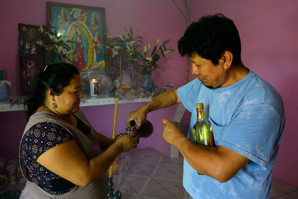 אנטוניו ואוגניה באטיסטה מנדוסה, משפחת אורגים זפוטקים – "אנשי העננים", קבוצה אתנית מתרבויותיה העתיקות של מקסיקו – מכינים בכל שנה מזבח כפי שהכינו אבותיהם. כיום מתחילים בהצבת תמונותיהם: הוריה של אוגניה, שהיו אורגים כמו ביתם, ואבא של אנטוניו שהיה נגן חצוצרה. משווקי החג שבכפרם, טאוטיטלאן (Teotitlàn del Valle), הם מביאים את המנחות המסורתיות, ביניהם מוצרים שמייצרים לכבוד החג, כפרחי הציפורן ולחם המתים, מוסיפים קנה סוכר ותפוזים המסמלים את היבול, מסקל משקה אלכוהול מצמח האגבה, ומסיימים בהדלקת הנרות והקטורת. המהדרים, כמוהם, שמים בדלועים את המזון, ובעיקר תבשלי הבשר, המיועדים למתים בלבד. המקסיקנים מאמינים שהרוחות אוכלות את המזון המוגש להם, ומי שאוכל את מזון המתים לא ישבע לעולם.
