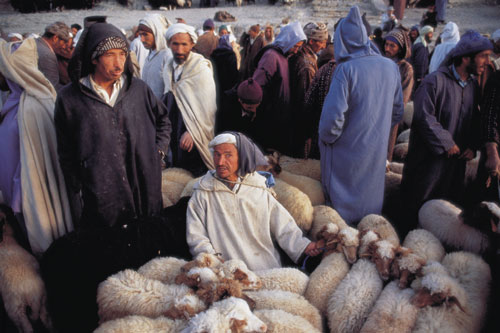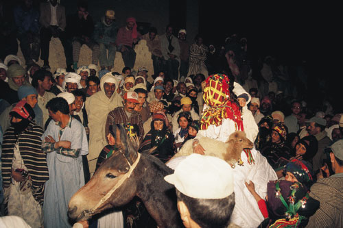 דוגמה למגמתיות השלטון בתחום זה אפשר למצוא בנושא שולי לכאורה – הנתונים הסטטיסטיים בדבר מספר הברברים במרוקו. הנתונים הרשמיים מדברים על יחס של 60:40 לטובת התושבים הערבים, בעוד שבאופן בלתי רשמי נמסר על יחס הפוך. למרות נטיית השלטון לערביזציה של מרוקו, ניכרים מאמצי פיוס והשלמה, שבאים לידי ביטוי במדיניות של נישואים בין בני משפחת המלוכה לבני משפחות ברבריות ובהוצאת עיתון רשמי בניב ברברי. ההיסטוריוגרפיה המערבית, ובייחוד זו של השלטון הצרפתי, הדגישה את המרכיב העממי בתרבות הברברית וניסתה להפחית את מקומו של האיסלאם בתוכה. כך מודגש בספרות זו מוצאם האירופי של הברברים, שכלל אינו ודאי, כמו גם אמונות ומנהגים שהוגדרו כקדם־איסלאמיים. מזווית אחרת אפשר לראות את התרבות הברברית דווקא כדוגמה נוספת להצלחתו של האיסלאם להכיל בתוכו תרבויות שאינן ערביות. מקומה של הדת העממית אכן חשוב, והוא מתבטא בעלייה לרגל לקברי קדושים, במאגיה וכישוף ובייחוס כוחות לאיתני הטבע. אבל נוכחותם של כל אלו חזקה ומשמעותית גם במרוקו הערבית (ראו גם כתבה בעמ' 48), ודת עממית מתקיימת בצד הרשמית גם בדתות ובמקומות רבים אחרים בעולם. ובכלל, קשה להטיל ספק בהיותם של הברברים מוסלמים. כמעט כל שמותיהם הפרטיים לקוחים מהקוראן, אפילו בכפר הנידח ביותר נמצא מסגד והם מקיימים את מצוות העלייה לרגל למכה. אחת הדוגמאות לגיוון ולשוני בין שבטים ברבריים היא גישתם לנושא הנישואים והגירושים. לחתונה בכפר תמתאטושֶה (Tamtatouche) הגענו לאחר נסיעה של 13 קילומטר במעלה עמק טודרה. בכפר מתגוררים אנשי איית חדידו (Ait Haddidou), שעמדתם מתירנית בהשוואה לאזורים אחרים במרוקו בכלל ולאזורים העירוניים במיוחד. לעומת ערבוב המינים הבלתי צפוי אצל איית חדידו, בחתונה אחרת שבה ביקרנו, אצל שבט איית עטה (Ait Atta), השוכן דרומית להרי האטלס הגבוה, היתה הפרדה מוחלטת בין בנים לבנות. החתונה התקיימה בשני אוהלים, אוהל נשים ואוהל גברים. רק כאשר קמו הרווקות והרווקים לרקוד את ריקוד ה"אחידוס" מחוץ לאוהל, התרחש המפגש ביניהם. את האחידוס, או "אחוואש" כפי שהוא מכונה באזורים אחרים, רוקדים באירועים טקסיים רבים, כמו חתונות, חגים, עלייה לרגל לקברי קדושים ועוד. שורה של גברים, שבידיהם תופי בנדיר, ניצבת מול שורת נשים, שתי השורות מתרחקות ומתקרבות זו לזו תוך כדי שירה, כאשר נושאי השירים משתנים בהתאם לאירוע.