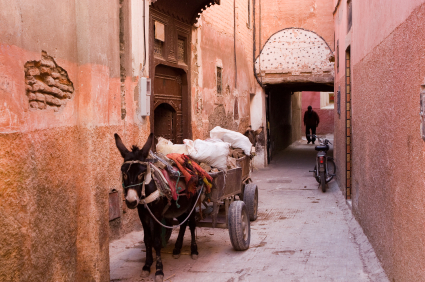 | עגלה רתומה לחמור בסמטה צרה במדינה של מרקש |