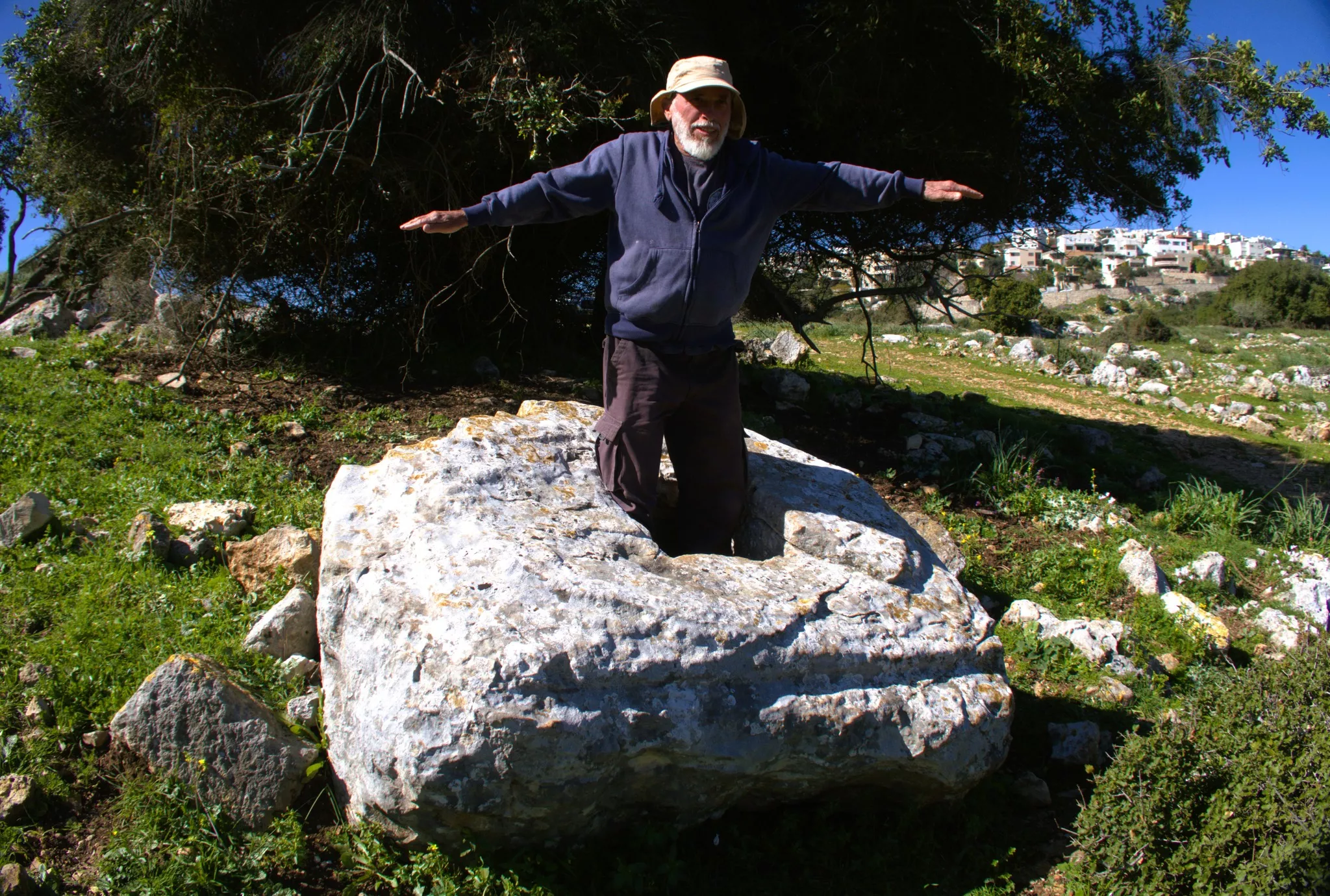 עם מיקי גולן ידידי איש הכרמל. כאן מיקי מדגים לי את פעולת מעצרת השמן עם הפתח המרובע בחירבת קרק