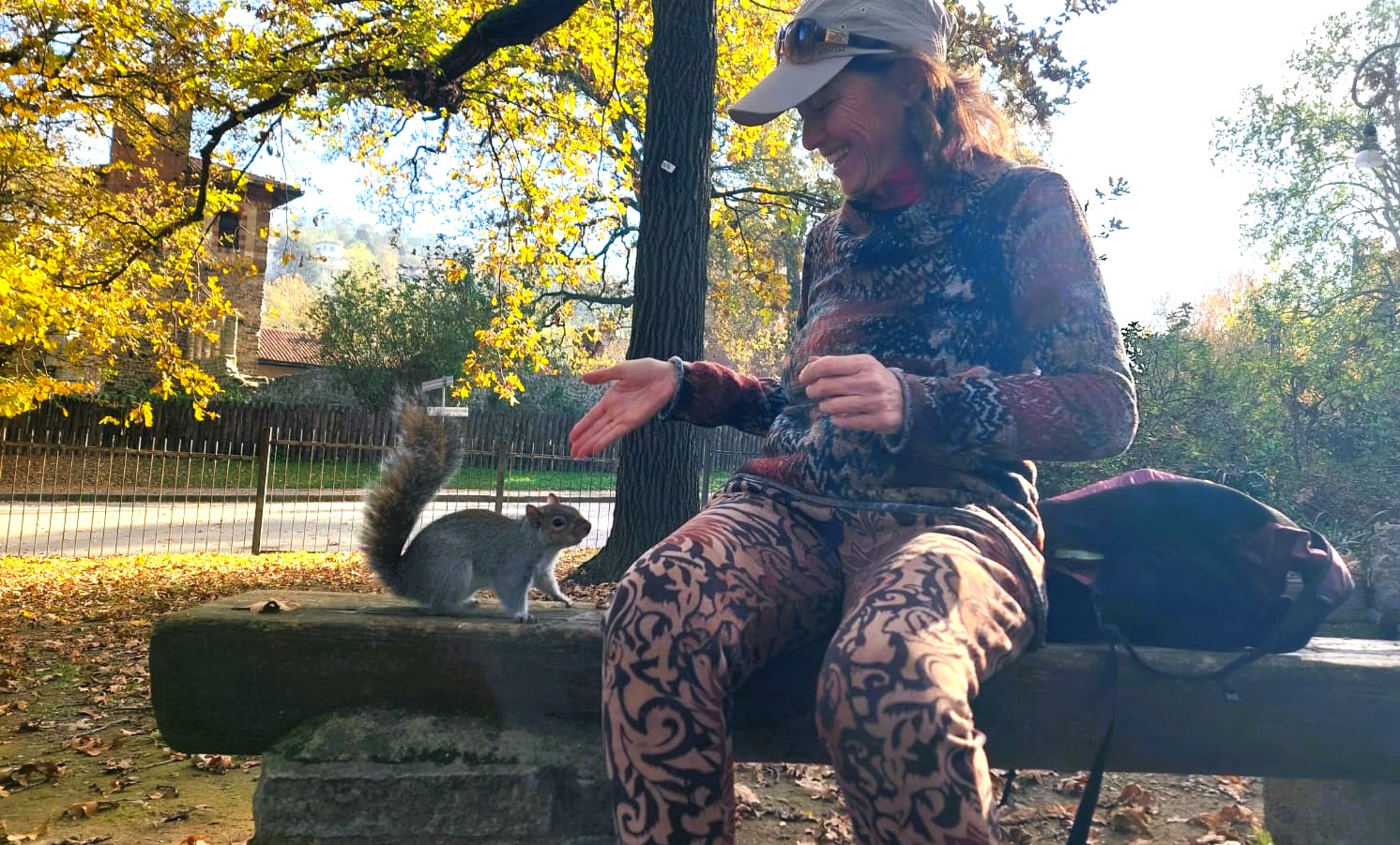 היום התחיל ערפילי ומלנכולי למדי, אבל בהמשך התפזרו העננים וקראנו לו יום של סנאים. בפארק ליד נהר פו פגשנו סנאים אפורים עבי זנבות שהתרוצצו במדשאות וטיפסו על הגזעים. לפתע מצאנו את עצמנו סנאי ואנוכי לופתים את אותו גזע עץ ענק, מתבוננים זה בזה במרחק סנטימטרים ספורים המיועדים בדרך כלל לטרום נשיקה רומנטית. ביקשתי ממריאנה לצלם אותנו ככה ביחד, אבל היא העדיפה לשלוף שזיף מיובש ולפתות אותו לבוא אליה.
