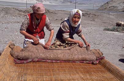 מדורת השבט דבר אחר שמצוי בכל יורטה הוא כלי החיבוץ לחמאה או לחלב הסוסים המוחמץ (קוּמיז בקירגיזית). החמאה המעורבבת במים ובתה והקומיז הם משקאות חמים עתירי אנרגיה, ומכאן חשיבותם. לא בכדי נקראת בירת קירגיזסטן כיום בישקק (Bishkek), שפירושו מוט החיבוץ של הקומיז. עמי הערבה מייחסים משמעות רבה ליציאה מהחלל הפרטי ולכניסה אליו. בצאתם מהיורטה אל הערבה הם מבקשים את ברכת האלים, ובשובם הם מבקשים למנוע את כניסתו של הרע. מטעמים אלו התפתחו מוטיבים אמנותיים רבים המסמלים את התפילות הללו. לשיא גימורם הגיעו העיטורים ביורטות הקירגיזיות: פתחה של היורטה מכוסה בדרך כלל ביריעת לבד עבה נפרדת הקרויה בשפה המקומית שירדָק, שאותה אפשר לגלגל מעלה כדי שאור ואוויר יחדרו לחלל הפנימי. שלא כשאר היריעות, יריעות שירדק מיועדות לחיפוי הצד הפנימי של היורטה ולכיסוי פתחה, והן עשויות מִגזֶרֶת של פיסות לבד צבעוניות. מבט בוחן ילמדנו שבצד העושר הצבעוני של יצירות אמנות אלו, יש בהן מוטיבים חוזרים. האלמנט הבסיסי בשירדק הוא מעוין, המסמל את היחידה הבסיסית של שלד קיר היורטה, ולפיכך את היורטה כולה. מסיבה מסוימת בחרו הקירגיזים דווקא מוטיב זה ולא את צורת היורטה השלמה כדי לייצג את הבית. בתוך הריבוע מופיעות כמה דוגמאות, אך הנפוצה מכולן היא של ארבע עד שמונה דמויות אדם שיושבות בחברותא, סביר להניח שבסעודה, מוגנות על ידי הריבוע התוחם המסמל את היורטה. סביב המעוין מופיעים כמה אלמנטים נפוצים, בהם נבט עם קרני שפע מסולסלות שמסמל את ברכת הערבות והעדרים (מוטיב זה מופיע פעמים רבות גם בחלקה החיצוני של היורטה, סביב בסיס הגג). מעבר לריבוע יש מסגרות משוננות שמסמלות נהרות והרים. הנהרות הם מקור המים המחיים, ההרים הם החובקים את הערבות ומעניקים חומת מגן טבעית. |