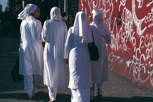 צועקים. בדיינר ברחוב 125, מעל לראשי הלקוחות ותוך כדי רשימת הזמנה, שואגת המלצרית את גערותיה לעבר עובדי המטבח, ואלה משיבים לה בקול גדול ומלא כעס. 20 רחובות דרומה משם לא יישמע דבר כזה. בהארלם יש עדיין אנשים של ממש. הם חיים, מתרגזים, שמחים ומגיבים. מישהו עולה על גג מכונית ומחלק פקודות בצעקות. מאות אנשי "אומת האיסלאם" מסתדרים בשלשות לאורך הרחוב. על המדרכה מנגד מסתדרות בשלשות האחיות המוסלמיות, מטפחות לבנות מכסות את שערן. בסדר מופתי סובבים כולם שמאלה ומתחילים לצעוד. חלק מהצועדים לבושים במדים כחולים, שמזכירים בגזרתם מדים של נערי מעלית, מעוטרים בסמל הסהר והכוכב האדום של "אומת האיסלאם". רוב המשתתפים לבושים בבגדים מצוחצחים, בחליפות חדשות, עניבות משי, מעילים ארוכים וכובעים משובחים. הם נראים יפהפיים, צועדים בטור ארוך, בשקט, במהירות. סביבם רצים אחיהם ועוצרים את התנועה בשדרה. הם עושים את דרכם לכנסייה הקורינתית ברחוב 116, מול "גרהם קורט". לכנסייה הזו מגיעים גם מרבית התיירים, אלה שמעדיפים סיור באוטובוסים ממוזגים על פני שיטוט רגלי ברחובות השכונה. חסידיו של פרחאן שכרו את הכנסייה כמסגד ליום אחד, ובה תושמע, באמצעות הטלפון, דרשה מיוחדת של המטיף הכריזמטי. קרוב לשם, במקום שאולי אין סמלי ממנו בהארלם – רחוב מרטין לותר קינג פינת שדרות מלקולם אקס, הנקראים על שם שני המנהיגים הבולטים ביותר של השחורים בארצות הברית – פועלים בשנה האחרונה סניף של "גאפ" וסניף של רשת בתי הקפה האופנתית "סטארבאקס". העסקים הגדולים מגיעים לשכונה אחרי שהיתה כמעט ריקה במשך כמה עשורים. עוד סיבוב בהיסטוריה מלאת התהפוכות של הארלם עומד בפתח. השכונה, כך נראה, נמצאת על סף פרק חדש בתולדותיה.