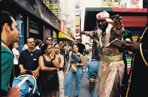 "קדימה, חמש דקות למסדר, אנחנו מאחרים!", שאג החייל הגבוה, וגלימתו האדומה בעלת שרוולי הזהב התנופפה מעל לנעליים הצבאיות הכבדות. ראשו היה מכוסה בכאפייה אדומה שמגן דוד רקום עליה, והיא מהודקת למקומה בסרט זהב סביב המצח. החיילים האחרים – הנמוך בגלימה הסגולה עם הסינר החום, השמנמן בגלימה הלבנה בעלת ציציות הזהב וכל חבריהם – מיהרו להעמיס את הציוד. כעבור חמש דקות בדיוק התייצבו כולם מול המפקד בשורה ישרה ובדום מתוח. "אתה, אתה ואתה תעמדו בצפון מזרח ותפקחו עין", הנחית המפקד, בבגדים אזרחיים ובנעליים צבאיות. "אתה ואתה תשמרו בפינה המערבית. אתה נשאר ליד האוטו ושומר על הציוד. אני מבקש לדווח בקשר על מועדי התחלה וסיום, ולא להתפנות מהשטח לפני קבלת אישור ממני או מהכוהן הגדול הרגדיה". לפי הטון הצבאי אפשר היה לחשוב ש־11 הגברים הצעירים בתלבושות הצבעוניות יוצאים לפעולת אבטחה בשטחים, ולא לאחר צהריים שטוף שמש בטיימס סקוור (Times Square), ניו יורק. התדריך הסתיים בהצדעה חגיגית: כולם חבטו באגרוף קמוץ על החזה, הניפו את היד המאוגרפת למעלה וקראו בקול גדול "יאהווה, יאהווה, יאהווה, יקדש השם", כך, השם המפורש בעברית, במבטא אמריקאי כבד. יום שבת, אחת בצהריים. רחוב 126 בהארלם, ליד מחסן הציוד של הכנסייה  | | "מחנה" טיימס סקוור, האתר שעימו מזוהים האיזראליטים יותר מכל מקום אחר. הרבה עוברים ושבים, הרבה תיירים, סיכוי לא קטן שמישהו יעצור לשמוע את המסר |