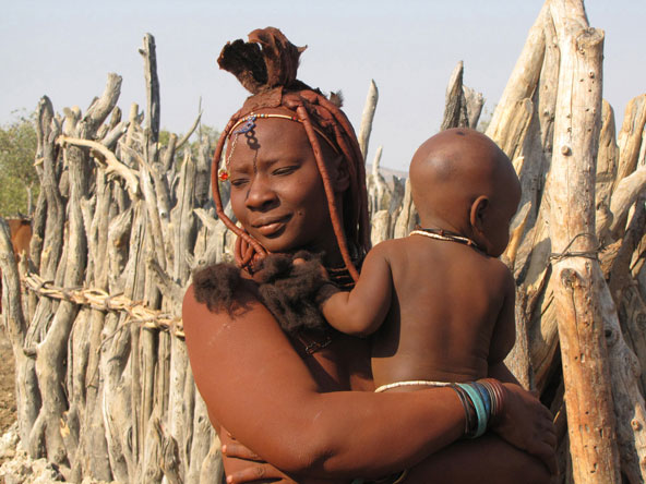 בת שבט ההימבה עם תינוק. נשות השבט מושכות את עורן ושערן באדמה אדומה