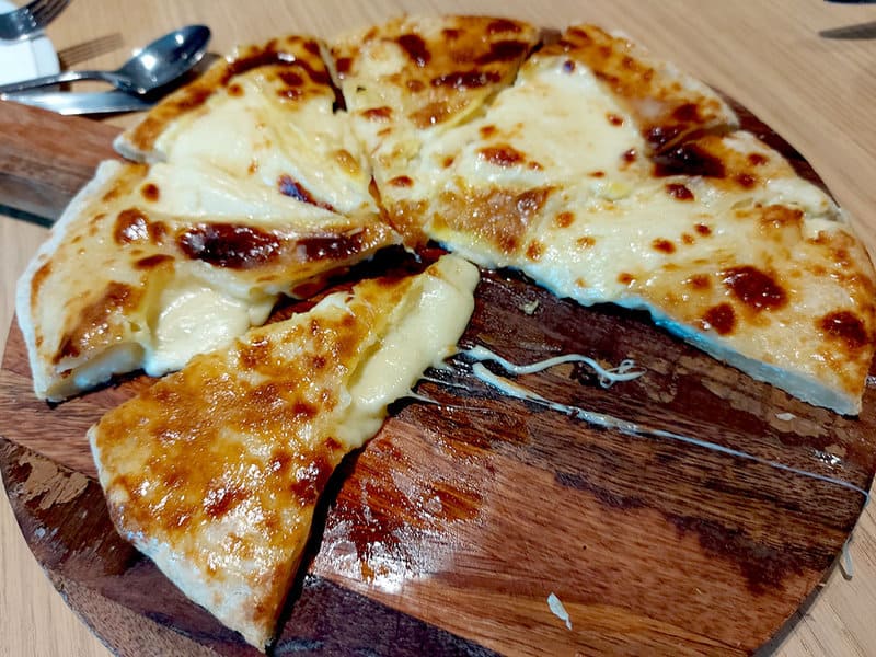 את החצ'פורי הראשון שלי בטביליסי, הראשון מיני כמה וכמה (וכמה…), פגשתי בארוחת בוקר ביום הראשון בעיר. הוא היה שונה לגמרי מהחצ'פורי שאכלתי בטיול בבאטומי לפני שנים אחדות. שם הוא היה עשוי מבצק שמרים, מעוצב בצורת סירה, עם ביצה חיה שנפתחה במרכזו מיד עם צאתו מהתנור והתבשלה קלות בחומו של המאפה. ואילו זה של טביליסי הזכיר במראהו פיצה לבנה – מאפה בצק עגול, בקוטר של פיצה משפחתית, פרוס למשולשים, אלא שבשונה מפיצה, כאן הגבינה היתה בתוכו, בין שני עיגולי בצק דקים. למעשה זוהי לא גבינה אחת, אלא תערובת של כמה סוגי גבינות. והטעם? כזה שהשכיח מיד את ספירת הקלוריות, רמת הכולסטרול ושאר עניינים של שמירה על המשקל. בסך הכל מדובר בסוף שבוע אחד, ניחמתי את עצמי, סוף שבוע שבו מותר לשכוח מההגבלות ולהתמסר לחצ'פורי. חמים, שמנוני וטעים כמו חלום.