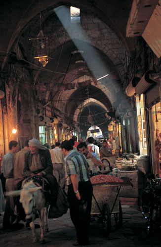 יזור הזה משובב עין ושונה מרוב סוריה, המזכירה בצחיחותה את הנגב שלנו. הדרך עוברת בין עמקים משובצי שדות, כפרים קטנים וטרסות עם מטעים, ברושים ועצי זית. מדי פעם נבלעת המסילה במנהרות ארוכות ואפלות. כשמגיחים מהן לבסוף נפרשים שדות ארוכים, שאיכרים במכנסי שרוואל חורשים אותם במחרשה ידנית רתומה לפרים, ונשים עובדות בהם, כפופות מעל לתלמים. אפילו בעיתונים המקומיים בסוריה מתפרסמים מדי פעם מאמרים בגנות הפיגור הטכנולוגי שלה לעומת שכנותיה. הנשים בסוריה מועסקות רק לעיתים רחוקות בעבודות מחוץ לבית. אחת הטענות ששמעתי יותר מפעם היתה שהן עלולות להוות "פיתוי למעסיקיהן הגברים", ובכך להסיט אותם חלילה ממילוי משימותיהם. בערים לא רואים נשים עובדות, גם לא במסעדות. כל העובדים, ממלצרים ועד טבחים, הם גברים. אבל מחוץ לערים, בשדות, נראה שרוב כוח העבודה הוא נשי דווקא. ובכל זאת, בחלבּ למשל, במיוחד ברובע היוקרתי אל־ג'דאידה, ראיתי נשים יפהפיות ומטופחות, בנעלי פלטפורמה ובמכנסיים מגונדרים, מבלות בחנויות של מוצרי אופנה מובילים, במסעדות יוקרה ואפילו בברים. אפשר להסביר את המותרות הללו בארץ ענייה כסוריה, שבה השכר הממוצע עומד על כ־45 דולר בחודש, בכך שרוב הצורכים אותם שייכים כנראה לכת השלטת, העלאווית. הכת מהווה אמנם רק כ־12 אחוזים מכלל האוכלוסיה, אך היא מקורבת לנשיא, שגם הוא עלאווי. המיעוט הזה שולט על כל יתר האוכלוסיה: מוסלמים סונים (כ־70 אחוזים), נוצרים (כ־15 אחוזים) ודרוזים (כשלושה אחוזים). החנויות של חלב אכן מפוארות, אך עיקר פרסומה של העיר בא לה דווקא מן השווקים המקורים, מעין רחובות ארוכים ומסועפים, המתמחים בסחורות שונות. שוק העור אל־איטאקייה, שוק התבלינים אל־חיבאל, שוק הבשמים אל־עטארין, שוקי המזון א־סקאטייה ואל־בהרמייה, שוק הזהב והתכשיטים אל־איסטנבול, וגם שוק מיוחד לרעלות, לטורבנים ולכיסויי ראש. שווקים אלה נבנו, נהרסו ונבנו מחדש אינספור פעמים, בעקבות פלישות וגלי כיבוש של הפרסים, המונגולים, הערבים ואחרים. אבל אף אחד מכל אלה לא הצליח לכבוש את מצודה העיר המרשימה, אשר נותרה עד לימינו גולת הכותרת של חלב. כלת המדבר והמלכה המורדת כל ספרי ההדרכה למטיילים בסוריה מאוחדים בקביעה, כי אם באים לסוריה כדי לראות דבר אחד בלבד, תדמור היא הדבר. והם צודקים. 245 קילומטרים צפונית־מזרחית מדמשק, 200 קילומטרים ממערב לנהר הפרת, בעומקו של המדבר הסורי הענק, המכסה את רוב מזרח המדינה, מתרוממים לפתע בים השממה שרידיה עוצרי הנשימה של "כלת המדבר", עיר הסחר הקדומה תדמור (Tadmor, הנקראת גם פלמירה Palmyra). זהו האתר ההיסטורי המפורסם ביותר בסוריה, והוא נחשב לאחד מאתרי העתיקות המרשימים במזרח התיכון ובעולם כולו. במשך יותר מאלף שנים שימש נווה המדבר בתדמור כחניית הביניים המרכזית של שיירות הסחר הגדולות, אשר נעו בין מסופוטמיה לאיזור הים התיכון. במאות השנייה והשלישית עלתה העיר לגדולה והיתה לאחד ממרכזי הסחר והעושר העיקריים באותה תקופה, עיר קוסמופוליטית שבה חיו פרסים, יוונים, רומאים וערבים. היא סופחה לאימפריה הרומית במאה השלישית לספירה, ונשלטה משנת 267 על ידי המלכה האגדית זנובּיה – אשה בעלת כישורים יוצאי דופן ואמביציה גדולה, אשר העזה לקרוא תיגר אפילו על האימפריה הרומית. המלכה זנוביה הניפה את נס המרד ברומי בשנת 272, ונכשלה. נקמתם של הרומאים לא איחרה לבוא. העיר נבזזה, והמלכה נתפסה כאשר ניסתה לחצות את נהר הפרת, כשהיא רכובה על גמל. זנוביה נלקחה לרומא בשנת 274, אסורה בשלשלאות, ונגררה ברחובות העיר, כדי להציג בפני כל את הניצחון הרומי על המורדת החצופה. אבל גם מנצחיה חלקו לה כבוד. הקיסר אורליאנוס כתב עליה בזכרונותיו: "אלה האומרים שבסך הכל ניצחתי אשה אינם יודעים איזו אשה היא היתה, כמה נבונות היו תוכניותיה והחלטותיה, כמה נחושה היתה בהנהגת חייליה". אדוארד גיבון, מחבר "עלייתה ונפילתה של האימפריה הרומית", כתב שהמלכה זנוביה השתוותה ביופיה לקליאופטרה והתפייט ארוכות בתיאור שיניה הצחורות כפנינ