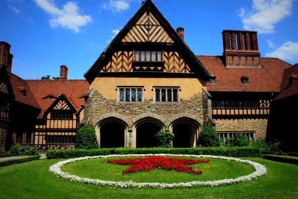 בצפון הגן ניצב ארמון יורשי העצר על שם הנסיכה ססיליה (Schloss Cecilienhof). לבקשתה תוך שלוש שנים, עד 1917, נבנה הארמון בסגנון טיודור שיתאים לגן האנגלי. הזוג המלכותי גר בארמון על 176 חדריו ו-55 ארובותיו במשך כשנה. ליתר דיוק רק הנסיכה גרה פה, הנסיך עסק ברדיפת נשים, כי מה עוד יכול נסיך לעשות בזמן מלחמה?