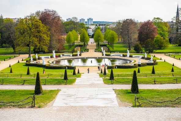 הפארק – מהיפים שבגני המלכים בעולם, עם טרסות מרהיבות ומזרקות המשתרעות על פני שטח של שלושה קילומטרים רבועים. מאות סוגי עצים מטופחים ב-36 טרסות הגובלות באגם גדול, שבו מזרקה השולחת נד מים לגובה של 38 מטר (בקיץ). בין עצי הנוי והמדשאות נמצאים (במערב) הארמון החדש ושכיות חמדה מרגשות כמו מקדש הידידות, מקדש העתיקות, בית תה סיני ומרחץ רומאי. הפארק מכונה גן התאווה (Lustgarten).