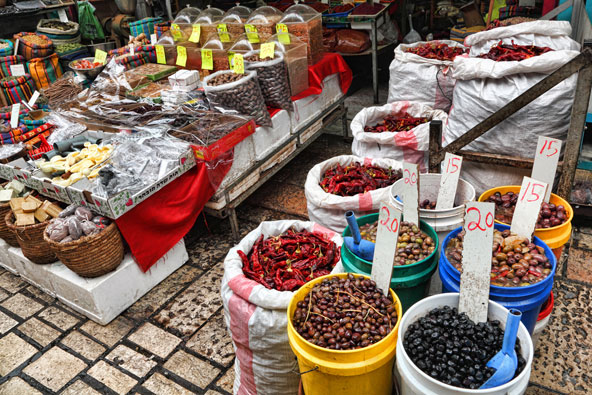 מול מערת הטמפלרים – שירותים, תחנה חשובה בכל סיור, ופינת החתלה מקסימה. זו הזדמנות לחלק מאתנו להתגאות בנכדים…. דלאל מצביע על דלת גדולה וסגורה. מאחוריה – חאן אל עומדאן, שנבנה בסוף המאה ה18 על ידי השליט אחמד אל ג'זאר. מתחם שלם שקפא ונותר תקוע בנבכי הפוליטיקה והבירוקרטיה. התושבים המקומיים פנו למוסדות לפתוח, לפתח, להשקיע, להרחיב, אבל בית המלון המתוכנן ויזמות נדל"ן שהורסת לפעמים כל חלקת היסטוריה, שומרת את הדלתות סגורות. כמה חבל! אנחנו צועדים אל הזהב, בחיפוש אחר האל דוראדו המקומי. מגיעים לדוכן. אחרי החלפת ברכות וחיוכים, צצות להן ביצי הזהב, כך מכונות קציצות הפלאפל הכי טובות בעיר. מה הופך אותן לכאלה? שאלה שנותרת פתוחה וסודית בגלל התבלינים. חומוס, טחינה ומשולשי פיתה קטנים צצים ומפתים ודלאל מסביר על האוכל של העניים ועל החומוס. איפה מגדלים, איך נראה שיח חומוס ואיך נהגו לאכול בעבר. כמה ים תיכוני ולא מנומס להאזין להסברים בעוד אנחנו בולסות מהקציצות הנפלאות. וכמה טעים! (מסעדת חומוס פול – שמסיה)