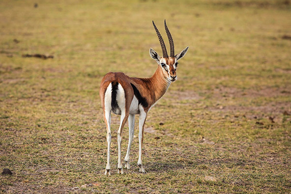 צבי תומסון הקטן בעל הקרניים השחורות והארוכות נושא משולש לבן ברור באחוריו, התחום בשני פסים שחורים, זנב שחור שמתנדנד כמטוטלת ללא הרף, ובטן לבנה עם פס שחור שמפריד בינה לבין הגוף החום. הנקבות צבועות באותה דוגמה והן בעלות קרניים דקיקות ולעיתים עקומות מחוסר תפקיד ממשי.