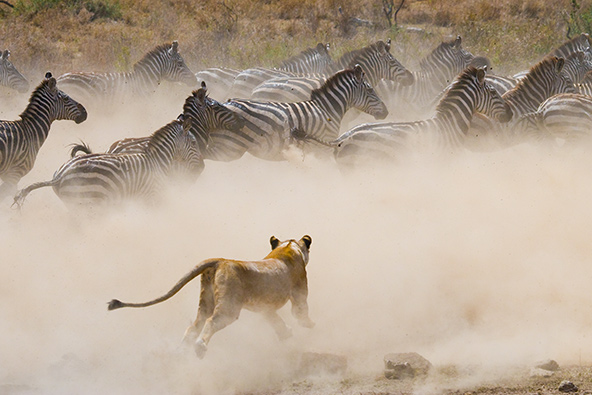 זברות בורחות מפני לביאה. החזקים שישרדו יעמידו צאצאים, והדורות הבאים ילכו וישתבחו