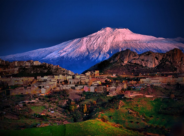 הר אטנההר אטנה (Etna), הר הגעש הפעיל ביותר באירופה הוא אחד מהאתרים שאין להחמיץ כשמבקרים בסיציליה. ההר שוכן במזרח האי, ובשל ההתפרצויות הלא צפויות שלו לא ניתן לטפס עליו, אבל יש סיכוי לא רע לראות את לועו המעשן, ועם קצת מזל תזכו לראות גם התפרצויות של לבה רותחת. ניתן לטייל ברגל או ברכב שטח במורדות ההר, בכפרים ובאזורים החקלאיים מסביב, בהם גדלים אגוזים, גפנים ועצי הדר. ניתן גם לעלות ברכבל לגובה של 2,900 מטר ולהתרשם מהמראה המיוחד ומהנוף המרהיב שנשקף מלמעלה, או לעלות ברכב שטח לנקודת התצפית בגובה של 2,400 מטר ולצאת לסיור רגלי על ההר.  פסגתו המושלגת של הר אטנה, הר הגעש הפעיל באירופה