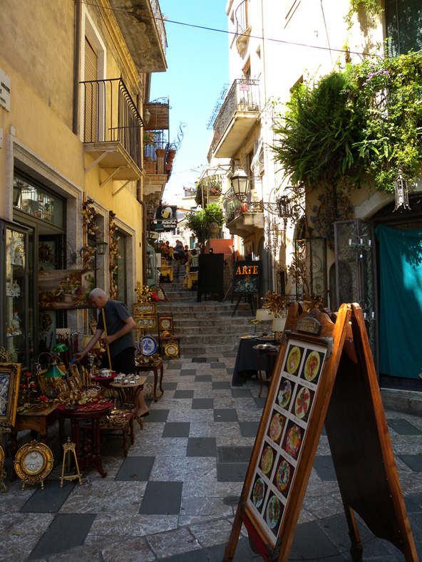 וילה רומנה הווילה הרומית הרומית המפוארת, שנבנתה ברבע הראשון של המאה הרביעית, שוכנת בסמוך לעיר הימי ביניימית פיאצה ארמרינה והיא הוכרזה כאתר מורשת עולמית. יש בה את אוסף הפסיפסים הגדול והמרשים בעולם מתקופת רומא המאוחרת, וכמעט כל חמישים חדריה מעוטרים בפסיפסים מרשימים. בפסיפסים המרהיבים מתועדים בעלי חיים, צמחים, סצינות יומיומיות וסצינות מהמיתולוגיה. אם אתם כבר פה, כדאי לבקר גם בעיירה קלטג'ירונה ששוכנת מדרום מזרח לווילה רומנה ומפורסמת בגלריות של אמני הקרמיקה שפועלים בה – מקום מצוין לרכוש בו מזכרות הביתה. טאורמינה טאורמינה (Taormina), אשר שוכנת בצפון-מזרח האי, נחשבת, ובצדק, לציורית מבין ערי סיציליה. זוהי עיר יפהפייה, השוכנת על מצוק מעל הים, כשמצידה האחד ניבט הים התיכון ונמצידה השני – הר אטנה. תענוג לטייל בסמטאות הציוריות ובמדרחוב קורסו אומברטו, המשובץ בחנויות ייחודיות, גלריות, מסעדות ובתי קפה. לאורך הרחוב יש כמה מבנים מעניינים, ובהם מגדל השעון הימי ביניימי, שער מסינה ושער קטניה, שנותרו מהחומה שהקיפה את העיר, וכיכר דואמו עם מזרקת שיש עתיקה והקתדרלה של טאורמינה. אל תחמיצו את התיאטרון היווני השמור היטב, השני בגודלו בסיצליה, ואת גני טראביליאן הססגוניים.  סמטה בטאורמינה, העיר שמשקיפה על הים ועל הר אטנה