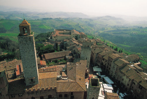 קו הרקיע של סן ג'ימיניאנו (San Gimignano) מופיע ונעלם חליפות כשנוסעים לאורך הכביש המתפתל המוביל אל העיירה. מוקף בנוף חקלאי, בין כרמי ענבים וזיתים, מציץ מרחוק על פסגת גבעה אוסף של מגדלי אבן. 14 מגדלים, שנותרו מתוך 74 שנבנו בימי הביניים, והפכו לסימן ההיכר ולסמלה של סן ג'ימיניאנו, "מנהטן של ימי הביניים".