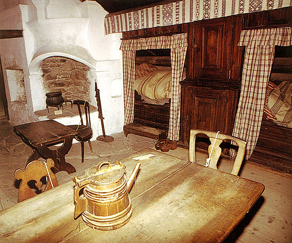 חדר שינה דני בן כ-150 שנה. המיטות קצרות כל כך כיוון שבני המאה ה-19 נהגו לישון בחצי ישיבה. בפינה ניצב קמין לחימום | צילום: טל גליק |