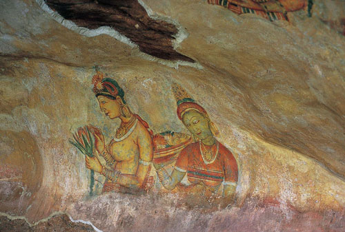 על "קיר המראות", הצמוד לקיר הסלע, נרשמו לפני אלף שנים שירים בכתב המגולגל והציורי של סינהלית עתיקה. מדרגות לולייניות מובילות אל ציורי קיר אירוטיים מרשימים ביופיים ובצבעוניותם. דמויותיהן של 18 נימפות עגולות חזה, פרחים בידיהן, נותרו על הסלע, מתוך כ־500 הציורים המקוריים. איש אינו יודע מי היו נשים אלה.