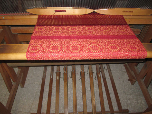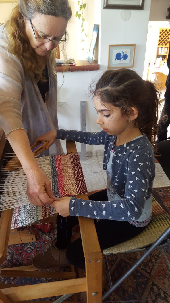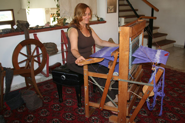 "זה עולם קסום ומעשיר", היא אומרת כשהיא יושבת זקופה מול נול העץ, אוחזת במסרק ואורגת שורה אחר שורה בתנועה מדיטטיבית. האריגים, התלויים כווילונות על החלונות בסטודיו המרווח ונראים לי כעבודות קולאז' מרהיבות, מתבררים כשלל ניסיונות לשזור בין סוגי חוטים וצבעים. על נולי עץ מתוחים אריגים בשלבי עבודה שונים ובארגז מסעות עתיק מגולגלים צעיפים לחורף ולקיץ, שנארגו בטכניקות שונות ומשלל חומרים. עקבות המסעות שלה ברחבי העולם ניכרים באריגים. למרות שאינה דוברת ערבית, בולגרית או יפנית, נסעה ללמוד אריגה ביפן, בבולגריה ובלקיה ותקשרה באמצעות החוטים שחשפו אותה לחוויות מרגשות: "האריגה היא עיסוק מאוד בסיסי בתרבויות השונות וזו גם הדרך שלי להכיר אנשים. במשך תקופה ארוכה נסעתי אחת לשבוע לישוב הבדואי לקיה שבנגב וישבתי בחברת הנשים על האדמה, כשהילדים הפעוטים מסתובבים בינינו ובנות שמונה כבר טוות ואורגות בעבודה פיזית מפרכת".