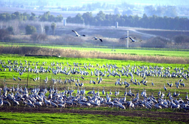 נדמה כי אין בארץ חובב טיולים שלא נתקל בשנים האחרונות באלפי העגורים שנוחתים בסתיו בעמק החולה. עד תחילת שנות ה-90 היו עוברים העגורים ממעל וממשיכים לאפריקה. בשנת 1993 החל פרויקט שיקום אדמות הכבול, שאחת מתוצאותיו היתה נחיתת עגורים רבים בעמק. מדי שנה נשארים רבים מהם לתקופת החורף, ובעקבותיהם מגיעים מטיילים רבים לצפות במחזה המרגש. אחת הסיבות להישארות הציפורים בארץ היתה הצפתו מחדש של חלק מהאגם, שיובש בשנות ה-50. אגמון החולה הרדוד מספק כיום לעופות המים מקום מתאים לשהייה. השינוי בסוגי הגידולים החקלאיים באזור השפיע אף הוא – החקלאים הפסיקו לגדל כותנה, ותחתיה התרבו גידולים דוגמת בוטנים ותירס, תפריט שערב במיוחד לחכן של הציפורים. ד"ר דן אלון, מנהל מרכז הצפרות של החברה להגנת הטבע, מספר כי עגורים מקצרים את נדידתם בכל העולם, וכי התהליך קורה גם בציר הנדידה המערבי  | עגורים רבים מבלים בעמק החולה את תקופת החורף, ובעקבותיהם מגיעים מטיילים רבים לצפות במחזה המרגש | צילום: באדיבות החברה להגנת הטבע |