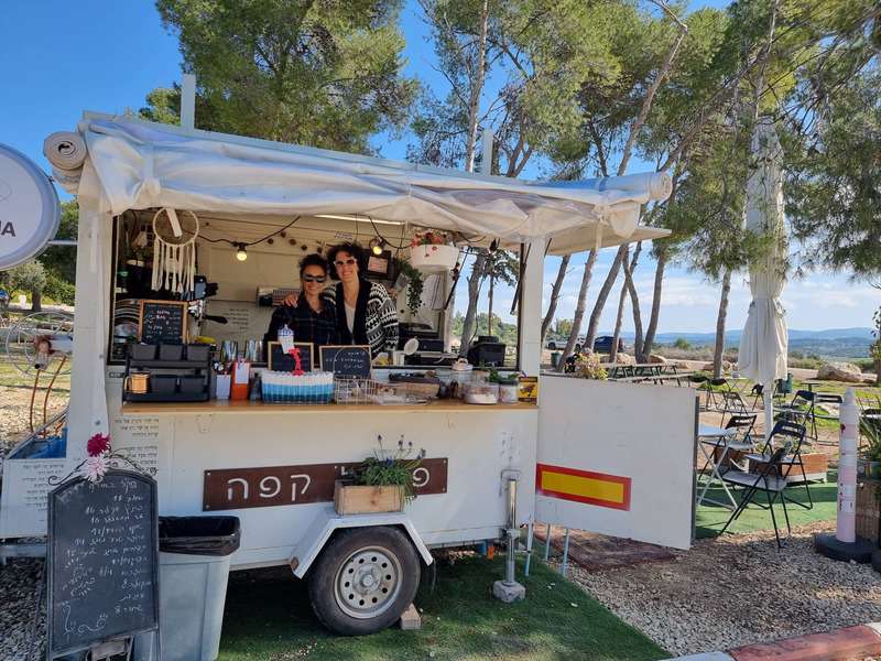 עגלת קפה ( כשר) מול כרם ירוק ומלבב בתוך נוף פסטורלי במושב תקומה, רק בימי שישי. ארוחות בוקר מרהיבות.