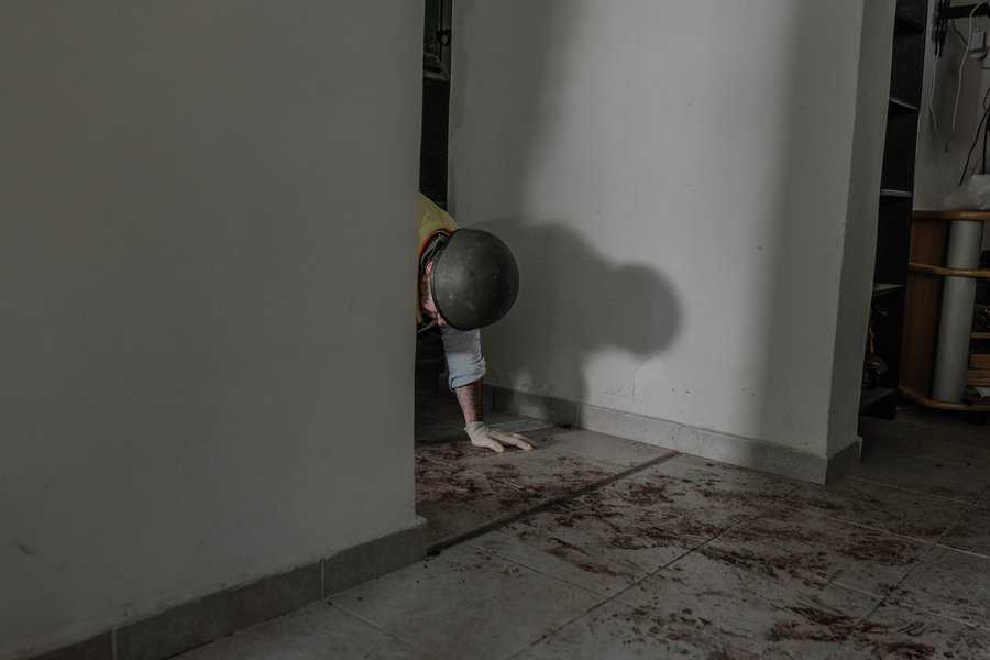 צילום השנה – מתנדב זק"א אוסף כתמי דם ורקמה אנושית בבית שבו נרצח קשיש ב־7 באוקטובר | צילום: חן ג' שימל