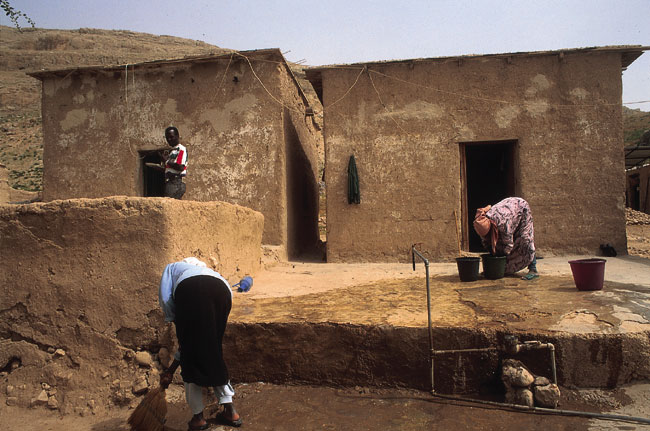 אחד דומה מאוד: בקדמת הפריים רואים מבט של ילד, לפעמים רק העיניים, וברקע – התרחשות עם ילדים אחרים. עוד דרך היא להראות מבט של ילד מול מבט של מבוגר. המבוגר מתנצל על מה שמצולם, בדרך כלל בעזרת חיוך, ואילו לילד יש מבט ישיר, שהוא למעשה מבוגר יותר מהמבט של המבוגר. תמונה שיש בה ילד שמח יכולה להעביר עוני? אני חושב שכן. הדברים אינם נחתכים בצורה כזו. זה תלוי בהרבה מרכיבים אחרים כמו חיתוך הפריים, שלוקח אותך לאיזשהו מאגר ידע שיש למי שמסתכל בתמונה. אילו מרכיבים אחרים מאפיינים צילום של עניים, של דפוקים? למשל, כאשר מישהו מסתכל אליך מהצד האחורי של הפריים; ואתה מגיע אליו דרך חיתוכים של אנשים אחרים או דרך עצמים שמסתירים אותו. הוא מופיע ומסתכל עליך. זה יכול להעביר מסר של עוני, של מצוקה. כל מעמד חברתי מצטלם אחרת? בהחלט כן. המעמד החברתי הגבוה יותר, למשל, אחיד יותר גם בתמונה. אין התנצלות ויש יותר הרמוניה. אני מודה שלא צילמתי הרבה מצבים של עושר, לא ב־א' ולא ב־ע'. אולי אני לא מסוגל לצלם את זה. יש דמיון בין מקומות שונים בעולם? הדמיון נמצא בעיני המסתכל. אתה יכול לחתוך את העולם לפי מדינות, אבל יותר קל לחתוך אותו לפי דרום וצפון. העניין החברתי מניע אותך? חשוב לך להראות לאנשים צד שהם לא מכירים? זה מסוג הדברים שנותן לי הרגשה שאני נוגע בחיים. אני רואה בכך שליחות. בדרך כלל, כדי לראות מה קורה מעבר לסביבה הקרובה שלך, אתה עושה זאפינג לסי.אן.אן. אבל אחרי שתי כתבות על רואנדה, אתה מסתלק משם. אבל הדברים האלה קיימים, וחשוב להכיר בהם, לראות אותם. יש לך הרגשה שאתה מנצל את המצולמים? כשהמצב דפוק, אנשים נאחזים בכל דבר, כולל ההצהרה: "אני שווה צילום".  | | במחנה פליטים, סמוך לבקעת הירדן. העולם מתחלק היום לדרום מול צפון יותר מאשר לאיזושהי חלוקה מדינית. |