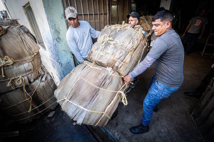 את העלים מהשדות של קאריטו פגשנו מאוחר יותר, עטופים בקליפת עץ הדקל ("יגואה") כאשר פרקו אותם ממשאית אל מפעל הטבק