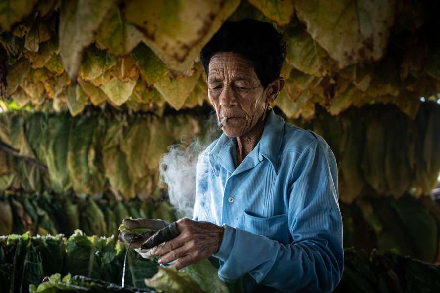 קאריטו מקדים את זריחת השמש וממתין לה. הוא לא שותה ולא אוכל בעיקר כי אין לו מה. בשעת הצהריים ינסה ללגום מרק עם שעועית אדומה. הוא רותם את צמד השוורים שלו, חורש וזורע איתם את האדמה. הופתעתי לראות את זרעי הטבק הקטנטנים ששפך לתוך כפות ידיו הבשרניות. כל זרע חום כגודל ראש סיכה. הוא שתל אותם תחילה בחממה ולאחר חודש וחצי העביר אותם לשדות. אנחנו הגענו אליו בשלב בו קטף את העלים משיחי הטבק שהגיעו בחודש פברואר, עד לגובה הראשים שלנו. נכנסנו לאסם הנראה כבית רעפים שוויצרי מקש, בו תלה קאריטו את העלים על מוטות עץ אופקיים. האחות של אשתו תפרה אותם לשרשרת בעזרת מחט ארוכה של שלושים סנטימטרים וחוט דייגים. העלים נחים כאן, מתייבשים ומשנים תוך כדי את צבעם כרמזור מירוק, לצהוב ולאדום זהבהב. נדמה כי כל עלה מקבל כאן תשומת לב אישית מוקפדת והכל הכל בעבודת יד. קאריטו אמר בחיוך שהוא דואג לעלי הטבק ומפנק אותם יותר מאשר את אשתו, כי אותם לא ניתן להשאיר לכמה שעות לבד. אשתו עוברת בין העלים ומוודאה שלא מגיעים אליהם מזיקים, שכן אסור לרסס את העלים.