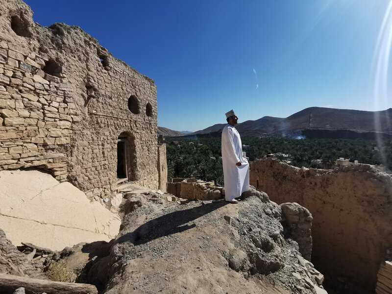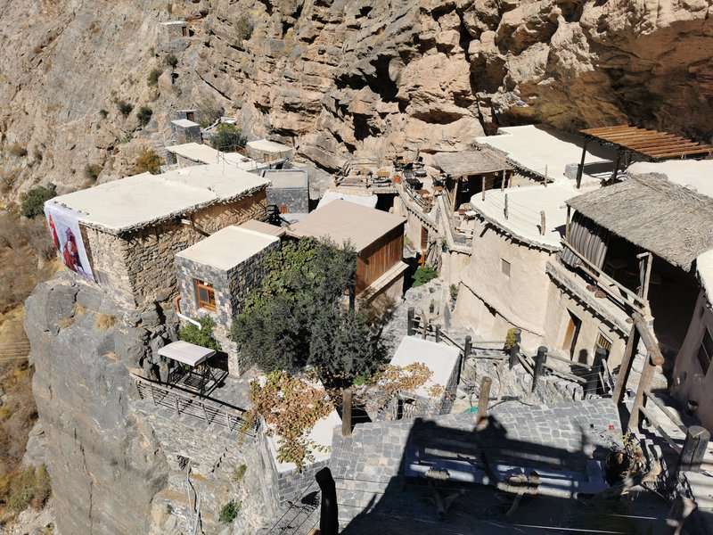 משם סף הריגוש בעומאן לא הפסיק לעלות. עם רכב שטח הגענו לכפר מבודד בו חיים חמש משפחות שמוצאן מתימן. בתי הכפר המקוריים תלויים על צוקי הסלע של ג'בל אחדר. הדרך היחידה להגיע לכפר היא מסלול הליכה נפלא מצד אחד של הקניון אל הצד השני. בתי האבן נבנו בגובה של כאלפיים מטר ולמרגלות הכפר בוסתנים, תעלות השקיה וטראסות.