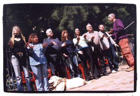 באולם תשעה משתתפים: חנה, מזל, אברם, אורה, מרים, אריה, סטאס, לאה וג´ינה, כלבת לברדור שהקדישה את חייה לליווי אחרים. ראשית המפגש בין יאיר לקבוצה היה בקבוצת התיאטרון של מרש"ל, שמשותפת לשחקנים עיוורים ורואים. יאיר היה שחקן מחליף בהצגה שהעלו, והמשיך כעוזר במאי בהפקה נוספת.