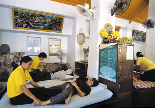 שוטטתי בין המקדשים והפסלים מוקסמת מהיופי, ההרמוניה, העושר הצורני והצבעוני, עד שהגעתי לפתחו של ביתן צנוע למראה ועליו שלט: "בית ספר לעיסוי תאילנדי מסורתי". בהמשך התחוור לי שאין קשר בין "האוניברסיטה הפתוחה" שייסד המלך ראמה השלישי ובין בית הספר לעיסוי, שבו כלל לא מלמדים על פי גילופי האבן. הנושא המרכזי הנלמד בו הוא עיסוי להרפיה, שמקורו בעיסוי העממי.