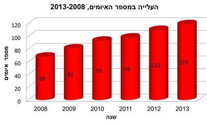 דו"ח האיומים השישי על השטחים הפתוחים של החברה להגנת הטבע לשנת 2013 חושף 119 איומים על השטחים הפתוחים, תשעה יותר מאשר בשנה שעברה, מתוכם 17 איומים חדשים, שלא היו בדוח הקודם. מהדו"ח עולה כי מרחב חיפה והכרמל הוא האזור המאוים ביותר בארץ, עם לא פחות מ-17 איומים סביבתיים. משנת 2008 ועד היום חלה עלייה של 75 אחוז בכמות האיומים, ונוספו בשנים אלה 51 איומים חדשים (ראו טבלה למטה). לעומת זאת, באותן שנים נרשמה הצלחה ב-28 מקרים, ושטחים פתוחים רבים בכל רחבי הארץ נשארו טבעיים בזכות כך.  הדו"ח, כולל, בין היתר, 10 איומים של הקמת יישובים חדשים, 29 איומים של פיתוח תשתיות תחבורה, 11 איומים של פיתוח תשתיות אנרגיה, 17 איומים של פיתוח כפרי וחקלאי, 20 איומים של פיתוח תשתיות למשק המים ו-17 איומים של פיתוח תיירותי. בין האיומים החדשים שנחשפו השנה ניתן לציין את קיטוע המסדרון האקולוגי במרחב גבעות אלונים על ידי כבישים ותשתיות; הקמת מתקן התפלה בשטחים החקלאיים של שורק (ראו תמונה למטה), ובנייה ברצף גבעות הכורכר והחמרה של נס ציונה, אזור בו מתקיים עולם עשיר של צומח, כולל מינים נדירים.