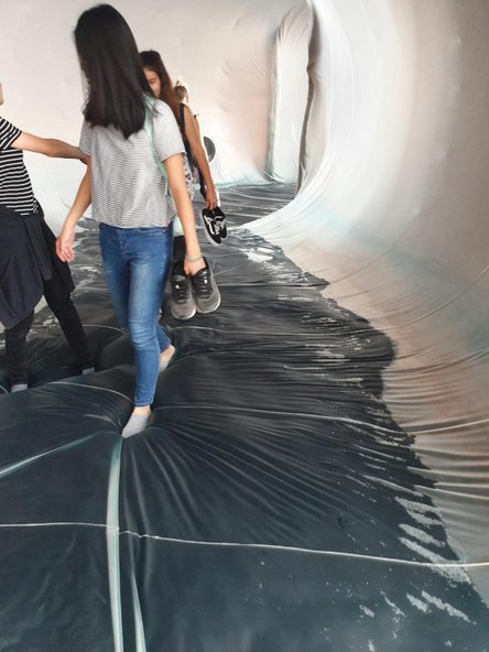 בביתן הבית של ונציה המבקרים מתבקשים לחלוץ נעליים וללכת על מצע פלסטיק שחור שנפרש על המים | צילום: הדס בכר