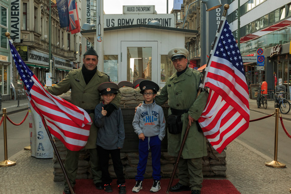 חומת ברלין חילקה את העיר בין השנים 1961- 1989 לחלק מזרחי בהשפעה ושליטה של ברית המועצות והגוש הקומוניסטי, וחלק מערבי בשליטה אמריקאית ומערבית. החומה, באורך של 155 ק"מ, בוצרה ושוכללה עד שהפכה למחסום כמעט בלתי עביר בין שני חלקי העיר. הפלתה בשנת 1989 הפכה לאירוע מכונן, שסימל את סוף המלחמה הקרה. הרבה מאוד מוזיאונים ומרכזי מבקרים בברלין מספרים את סיפור החומה, וסימון מיוחד על המדרכה מנציח את התוואי המקורי שלה. מפריחים בועות: גלעד ויואב מפריחים בועות סבון ליד הברלין דום (קתדרלת ברלין) אחד המקומות המעניינים לביקור עבור הילדים וגם עבורנו היה צ'ק פוינט צ'ארלי התיירותי – נקודת ביקורת שהיתה מעבר הגבול הנודע ביותר בין גרמניה המערבית למזרחית בלב ברלין. כנקודת הביקורת הבולטת ביותר לאורך החומה, היה צ'ק פוינט צ'ארלי נקודה מועדפת למרגלים, אנשי כוחות הביטחון וסתם סקרנים, וזכה לפרסום בספרים וסרטים רבים. היום מוצב במקום שיחזור של מחסום, ושחקנים חביבם במדי הצבא המזרח גרמני ישמחו להצטלם אתכם בתמורה לכמה אירו…