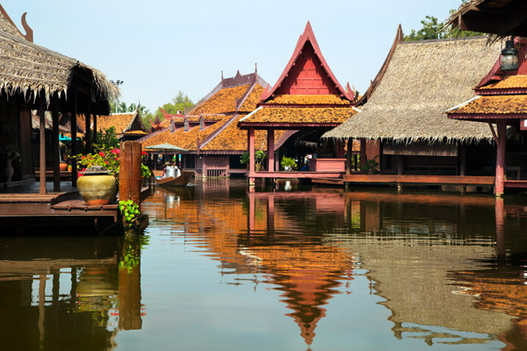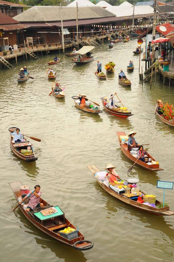 .jpg) אמפוריה בראווה. מתבקש להוציא את בגד הים מהארון בנגקוק, תאילנד בנגקוק, היתה ידועה במהלך המאה ה-19 כוונציה של המזרח, כשרשת ענפה של תעלות הקיפה את העיר ושימשה למסחר. מאז רבות מהתעלות נסתמו ובמקומן נסללו רחובות ונבנו בתי מגורים, אבל עדיין יש בעיר תעלות רבות, בעיקר בשכונת ת'ונבורי ששוכנת בצד המערבי של נהר צ'או פראיה ונחשבת לריאה הירוקה של העיר. התעלות, בתי הכלונסאות שלגדותיהן והצמחייה הירוקה מהווים מפלט מושלם מההמולה, הדוחק והלחות של בנגקוק. התעלות עדיין משמשות למסחר – כמה שווקים צפים פועלים בתעלות בנגקוק, ובהם ניתן להתרשם מדייגים וסוחרים ששטים בסירותיהם ומוכרים עליהן מכל טוב – דגים טריים, ירקות, פירות ומאכלים אקזוטיים.  התעלות, בתי הכלונסאות שלגדותיהן והצמחייה הירוקה מהווים מפלט מושלם מההמולה, הדוחק והלחות של בנגקוק