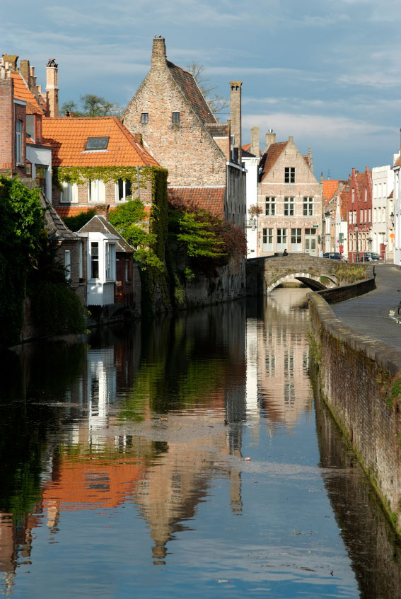 בתים עתיקים בברוז' משתקפים במים תעלה